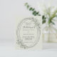 A sage green background. An oval faux silver frame decorated with sage green greenery. Personalize and add your names, details. Black text.