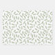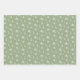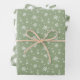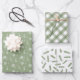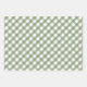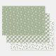 Winter holiday pattern wrapping paper sheets in sage green and white with snowflakes, plaid, and pine needles.