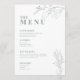 This menu is characterized by boho style, floral artwork, and sage green color, with a mix of different font styles, often in different sizes, to create a unique, eclectic look that makes these menus a natural aesthetic. Printed on high-quality cardstock, they will surely impress your guests and set the tone for your special day.