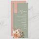 Add soft rustic charm to your reception with this personalized sage green wedding menu featuring each guest’s name in a vertical peach accent strip. Elegant script fonts and a calming green background pair beautifully with the romantic blush, peach, and ivory florals at the bottom, complemented by dried foliage for a subtle fall touch. Ideal for boho, rustic, or countryside weddings, this menu doubles as a stylish place card and keepsake. Easily customize the guest name and dinner courses for your special day.
