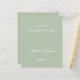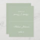 A simple sage green wedding place card with the guest name and the table number printed on its front and the bride and groom names and the wedding date printed on the other side (that is the other half, before folding it). All text is white calligraphic script.