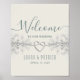 Elegant modern handwritten calligraphy script sage green wedding welcome poster with simple silver rope heart and vintage gilded floral lace.