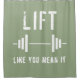 The bold and modern design features a sage green shower curtain with a barbell icon and the quote Lift Like You Mean It in a distressed white typography.