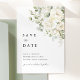 A refined sage green and white floral save the date design featuring soft watercolor blooms and an elegant photo back layout.