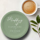 This simple solid sage green wedding paper plate features elegant white script for an outdoor ceremony in a nature setting. Minimalist typography on peaceful light green reception decor for a rustic venue outside near a forest of trees.