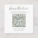 Sage green and white share the love QR Code cards. Place these small cards at your wedding reception tables so guests can scan to upload the photos they took at your wedding reception to your album or social media. To generate a new QR code on the design, add the URL of your online wedding album or social media handle in the area provided, using the "personalize" feature. A brand new QR code will then be added to to the design.