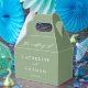 This simple solid sage green wedding favor box features elegant white script for an outdoor ceremony in a nature setting. Minimalist typography on peaceful light green boxes for a rustic venue outside near a forest of trees.