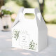 Custom-designed wedding favor box featuring modern elegant sage green and white floral design with personalized name and date.
