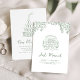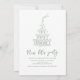 Unique hand drawn just married car announcement and champagne tower party invite on the back, with playful handwritten font in soft sage green, fun and elegant. Great for casual garden elopement party, artistic boho beach after party, and modern whimsical wedding reception.