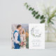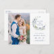 This elegant save the date postcard features a beautiful watercolor navy blue and sage green botanical wreath with a photo of the bride and groom on a white background. The text is navy blue but can easily be changed to suit your wedding style.