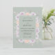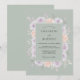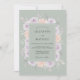 A delicate floral arrangement in soft pastel hues of lavender and peach adorns a muted sage green background. The artistic watercolor style evokes a gentle and romantic mood, perfect for an elegant affair.