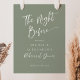 Sage Green Welcome Rehearsal Dinner Sign. Personalized Simple Minimalist The Night Before Sign. Just click the customize further link, shown under the text personalization area on the right, and choose your custom color background. This sign poster template makes it fast and easy to create stunning additions to your wedding decor. Signs can be enlarged, there are many sizes to choose from, as well as options for custom framing and matting.