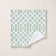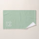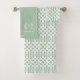 Sage green and white trellis patterned bath towel set personalized with your family monogram or other text in a rustic laurel branch. Use the design tools to choose any background colors, edit the text fonts and colors or upload your own photos to create a one of a kind design. The perfect touch for your modern farmhouse bathroom decor!