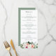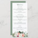 A chic and modern menu card to enhance your place setting. This design features white roses & eucalyptus with blush, pink & peach floral elements. Give your guests all the information they need in a clean serif font. The back features your monogram against a full color, rich sage green background.