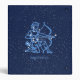 Binder featuring the zodiac symbol for Sagittarius in soft silver blue, overlaid with the stars of the constellation, against a starry sky background of deep midnight blue