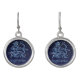 Drop earrings featuring the symbol for Sagittarius in soft silver blue, overlaid with the stars of the constellation, against a starry sky background graded from deep midnight blue to black.