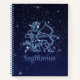 Spiral notebook featuring the symbol for Sagittarius in soft silver blue, overlaid with the stars of the constellation, against a starry sky background graded from deep midnight blue to black.