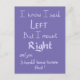 ‘ I know I said LEFT but I meant RIGHT and you should have known that!’ The perfect funny greetings postcard for wives, boyfriends or girlfriends, or friends who suck at giving directions and just can’t be wrong. This witty car directions driving argument Joke Humor word art slogan greetings postcard for her or him. Created by The Sweetmans