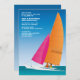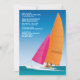 A sunny invitation with all the sights and colors of summer on the water. The card features a beautiful blue sky with a white catamaran sailboat. The boat has hot pink and orange sails and a couple on board. The perfect summer invitation for any occasion or gender.
