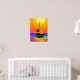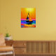 Poster in a vibrant sailboat with colorful sails glides across the water, reflecting the stunning hues of a radiant sunset. The sky and sea create a mesmerizing blend of orange, yellow, blue, and coral tones