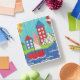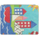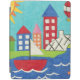 A cityscape serves as the background for a sailboat and a hot air balloon. A bright sun shines down on the scene, and a cute fish swims under the water. Purchase this peaceful print today!
