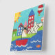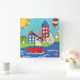 A cityscape serves as the background for a sailboat and a hot air balloon. A bright sun shines down on the scene, and a cute fish swims under the water. Purchase this peaceful print today!