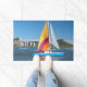 This door mat has a colorful sailboat pictured on it.