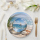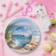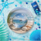 A serene coastal scene showcases a sailboat beautifully reflected in a glass sphere, surrounded by seashells and green grass on a sandy beach.