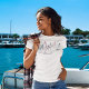 This is a cute casual top. Six sailboats with brightly colored sails race across the t shirt. An original design by Gingezel. The Gingezel Ocean Villa Collection captures the ambiance of that special vacation in carefully coordinated sophisticated geometrics, patterns, and stripes.