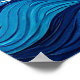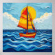 Vibrant, textured artwork depicting a colorful sailing boat on wavy blue water under a bright sun. The sailor is dressed in blue, and the sail is painted in shades of red and orange, adding warmth to the serene scene against a blue sky with fluffy clouds.
