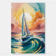 A stunning, dynamic illustration of a sailboat cutting through vibrant turquoise waves under a radiant sun and dramatic, colorful sky. The swirling motion of the sea and the warm, glowing hues of the sunset create a sense of freedom, adventure, and serenity. Perfect for bringing a sense of movement and energy to any space.