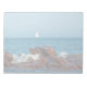 A photograph of a sailboat on the horizon, and waves crashing into the rock formation near the shore.