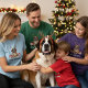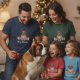 "This stunning illustration features a detailed portrait of a noble Saint Bernard dog with its characteristic large head, expressive markings, and powerful build. The dog is given a festive holiday touch with reindeer antlers adorned with small blue and green ornaments. Two beautifully wrapped Christmas presents with red ribbons sit prominently on either side. This high-quality graphic is ideal for personalized holiday gifts for Saint Bernard owners, Christmas cards, winter apparel, mugs, or any product celebrating this magnificent and loyal dog breed."