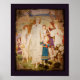Fine art depicting Saint Brigid dressed in a white gown surrounded by followers carrying red flowers. Vintage 19th century painting by the Scottish artist John Duncan.