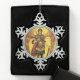 A beautiful Russian Icon Christmas tree ornament of St. Michael the archangel. Silver pewter snowflake. Prayer to St. Michael the Archangel: "St. Michael the Archangel, defend us in battle. Be our protection against the wickedness and snares of the devil. May God rebuke him, we humbly pray. And do thou of prince of the heavenly Host, thrust into hell Satan, and all the evil spirits, who prowl about the world seeking the ruin of souls. Amen"