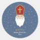 A Sticker for Saint Nicholas Day (who is celebrating at the beginning of December in Europe) with snow on a blue background and customizable texts.