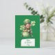 Celebrate in true Irish style on Saint Partick's Day with this fun postcard featuring an illustration of a leprechaun dressed in green attire, including a tall hat with a gold buckle, sitting down. The leprechaun is holding a large pot filled with gold coins. The leprechaun has large pointed ears and a red beard. There are two large shamrocks, one in each hand, adding to the St. Patrick's Day theme.