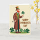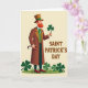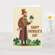 This St. Patrick's Day card features a friendly leprechaun-like fellow standing tall on a small patch of green grass dotted with shamrocks, set against a pale yellow background 💚. He has a full, fiery red beard and a calm, welcoming expression that feels like he’s posing for someone he cares about. A brown top hat sits on his head with a green band, matching the green waistcoat peeking out from under his long brown coat. Under the vest, a light blue shirt and a neatly tied green necktie add a tidy, dressed-up look. In his right hand he holds a large dark green shamrock, while his left hand rests on a simple walking stick, giving him an easy, companionable stance ☘️. The words “SAINT PATRICK’S DAY” appear on the right side in brown, all-cap letters that stand out clearly against the yellow. His bright red shoes sit firmly at the bottom of the scene, right above the scattered shamrocks in the grass.