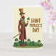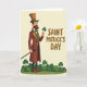 This card shows a cheerful gentleman standing slightly left of center on a soft, creamy background, dressed for St. Patrick’s Day with a tan top hat trimmed in green, a brown overcoat, and an emerald waistcoat with a matching bow tie 💚. He smiles with bright eyes as if greeting a close friend, and he lifts a small shamrock that feels like a quiet, friendly toast ☘️. A dark walking stick rests easily in his other hand, adding a relaxed, welcoming touch to his posture. At his feet, many clover leaves spread like a green carpet, echoing the shamrock he holds and tying the scene together. On the right side, the words “SAINT PATRICK’S DAY” are set in large, uppercase letters, stacked and easy to notice. The lettering appears in a dark green tone that matches the greens in his outfit and the clovers, balancing the warm browns of his coat. Subtle shading gives the coat and hat a little depth, while the clovers form a dense band of green along the bottom edge.
