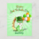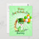 A golden horse shoe for good luck and a cute green Saint Patrick's bunny cartoon with a sweet heart shaped nose and blue eyes holding balloons, over it a lovely Happy Saint Patrick's Day message in the Irish flag colors.