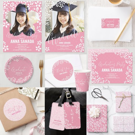 Plain white envelopes are included with paper invitations and will come to fit the invitation size you select. If you don’t need the envelopes, you may choose to not receive them by selecting the dropdown below "Envelopes" and choosing "None." If you’d like to have a design on your envelopes, you can browse all of these available envelopes to find the design that complements your Sakura Cherry Blossom Graduation Party Invitation.