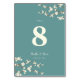 An original illustration of beautiful cream ivory white cherry blossoms or sakura spring flowers with light brown branches on a turquoise teal green background. This is a modern double-sided wedding table number card.