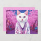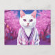 Postcard featuring funny fantasy art. A jazzy kitty in a stylish cardigan is among the blooming cherry trees. Great for anyone who loves modern kitties and humor and sakura ,spring theme.