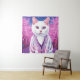 Introducing our delightful tapestry featuring whimsical fantasy art: a jazzy kitty adorned in a stylish cardigan, gallivanting among blooming cherry trees in full springtime splendor.