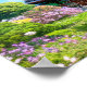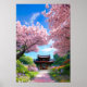 Immerse yourself in the natural beauty and cultural heritage of Japan with this stunning digital artwork, featuring a traditional, wooden temple surrounded by a beautiful garden filled with cherry blossom trees, colorful flowers, and lush green grass.