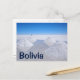 Postcard of drying piles of salt with reflection in the water waiting for the harvest on the Salar the Uyuni salt flats in southern Bolivia with the text: 'Bolivia'.