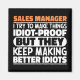 Funny Sales Manager Sayings "Sales Manager I Try To Make Things Idiot Proof But They Keep Making Better Idiots". Grab this Funny Sales Manager design as a funny gifts for an awesome mom, dad or friend.