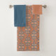 This towel set has a rust washcloth, a slate blue hand towel, and a bath towel with an art deco design of three salmon ovals broken across two very thin salmon rectangles with slate blue lines on a field of rust. Want the same design with different colors? Message me.