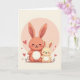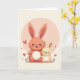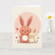 This card shows two stylized rabbit-like creatures cuddled close, with a larger salmon-colored figure standing protectively beside a smaller cream-colored one, their closed-eye smiles and rosy cheeks suggesting a gentle bond ❤️. Behind them sits a wide, soft pink circle that frames the pair like a spotlight and adds a cozy, romantic softness to the scene. Small red hearts float around their heads, reinforcing the tender closeness without needing any extra explanation. The color palette stays light and soothing, blending muted pinks, warm oranges, and pale creams for a calm, affectionate look. Minimal plant shapes near the bottom act like a simple garden setting, keeping the focus on the pair while hinting at a quiet outdoor moment 🌼. Any lettering would sit neatly above the illustration in a darker pink tone, centered and easy to read against the pale background. The lines are smooth with gentle shading, giving the characters a soft, rounded shape and a calm, affectionate presence. The larger rabbit’s long ears curve upward as the smaller one leans in at their side, surrounded by scattered hearts and tiny leafy sprigs.