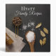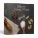 This elegant Salt and Pepper recipe binder is perfect for any kitchen. A dark gray background with salt, pepper, dried basil, and kitchen utensils are laid throughout the bottom half.